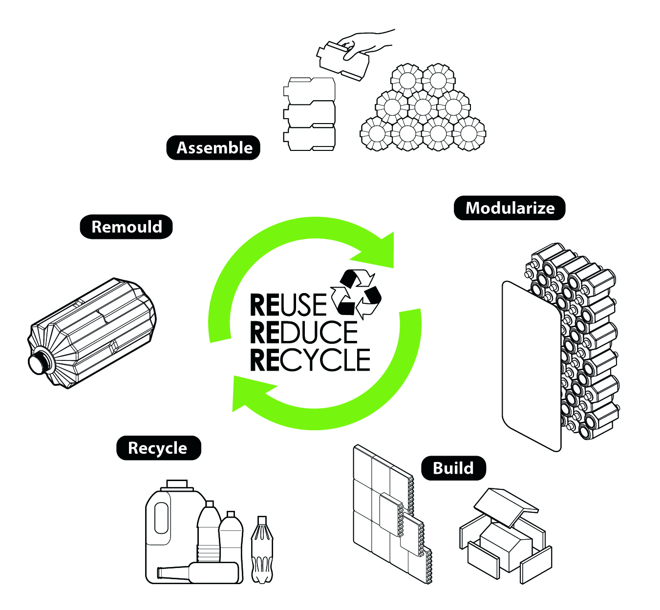 - Tanto la obtención del material plástico (PET) como su modelado, el Polli-Brick se produce localmente, cerca del lugar de construcción. Se reducen así los gastos asociados al transporte.
