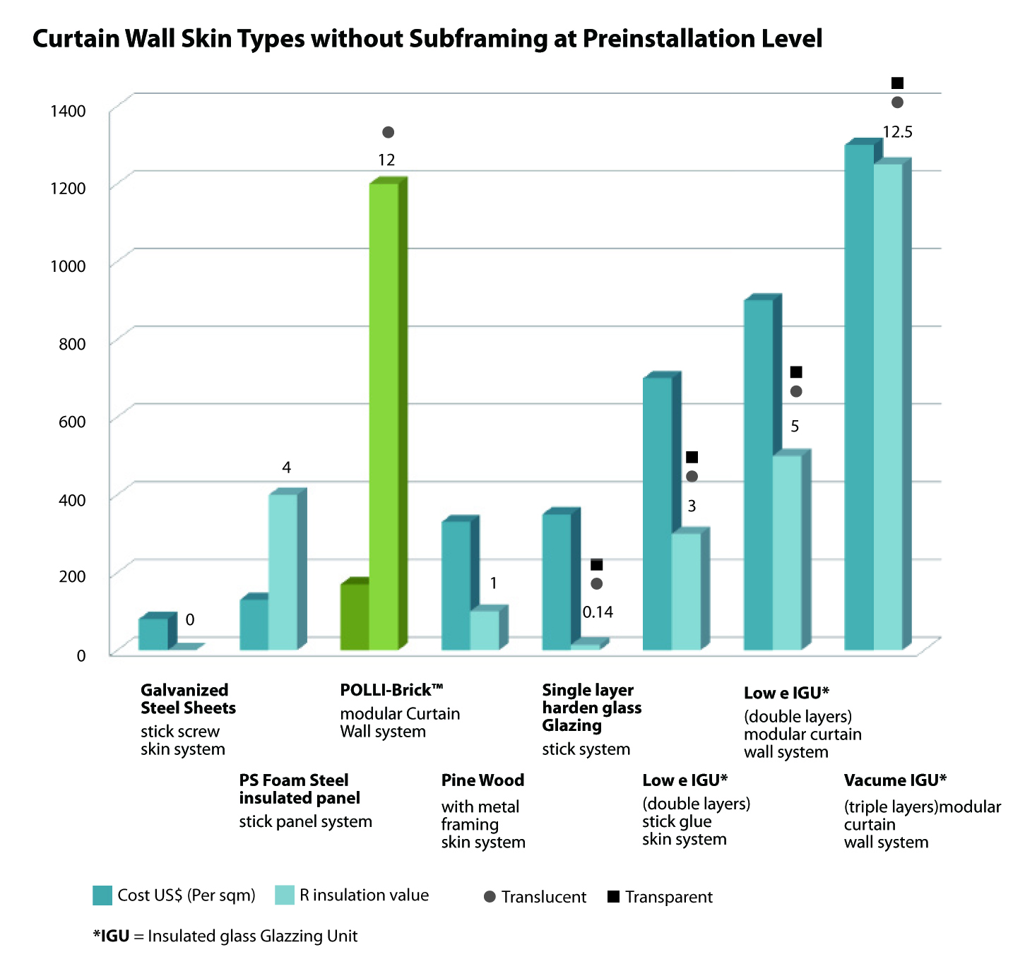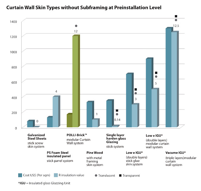 El sistema constructivo del módulo estándar para muros cortinas se compone por una subestructura metálica fijada a la estructura del edificio y el módulo de Polli-Bricks. Éste se compone de un